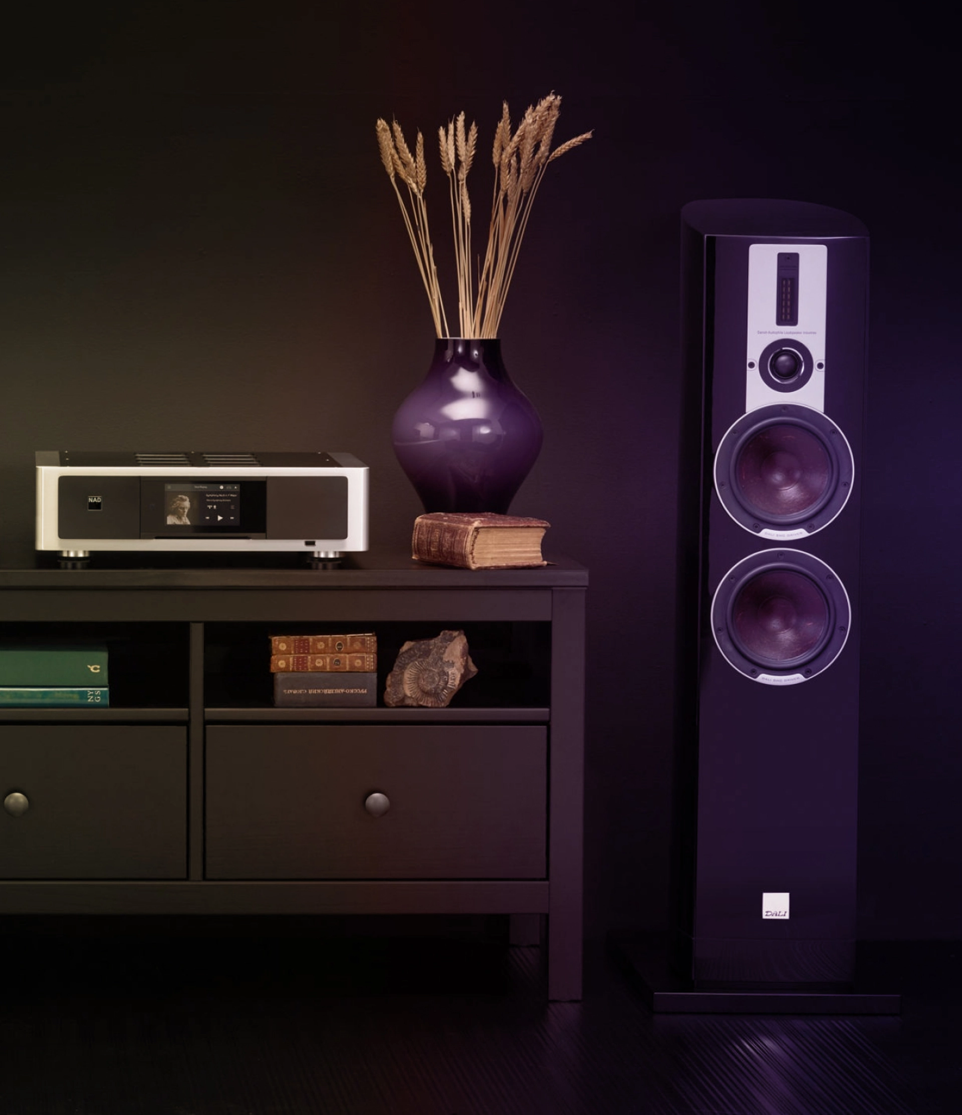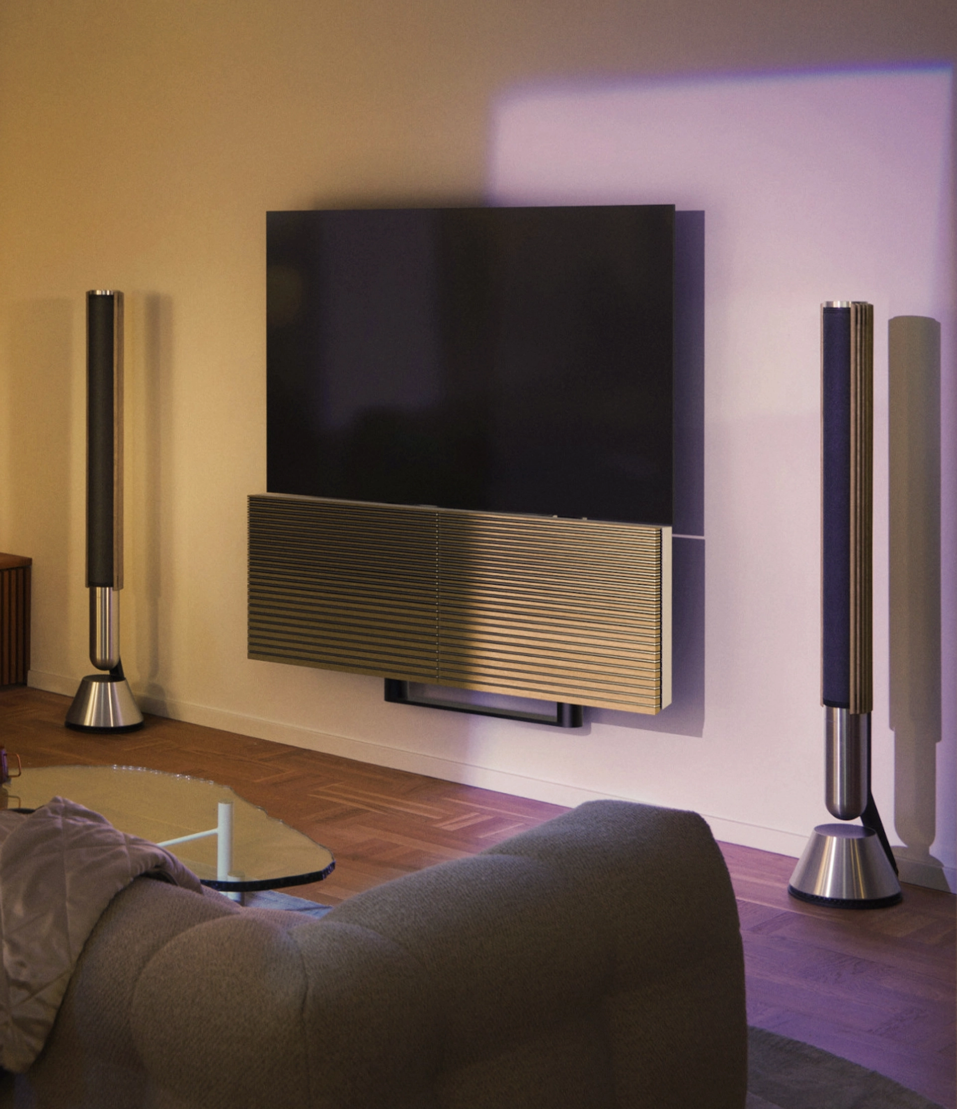 The system of the future, where all the components are hidden, and the sound flows from nowhere. No dozens of remotes, no bulky drawers in your room, you control everything from your smartphone. Voice control of sound and light in your home. This is already possible today.